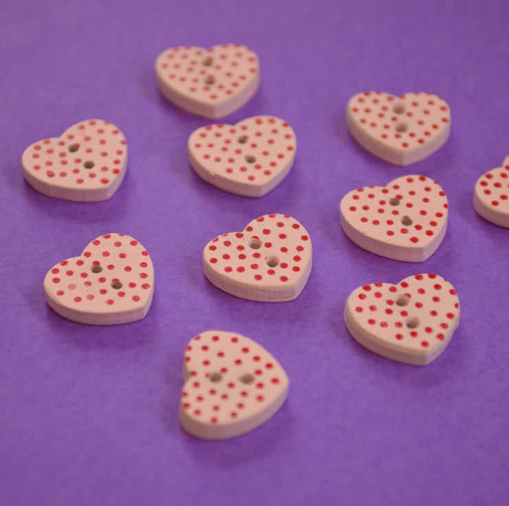 Little Wooden Dotty Heart Buttons Pale Pink 10pk Spotty Red Dot 13x15mm (WH9)