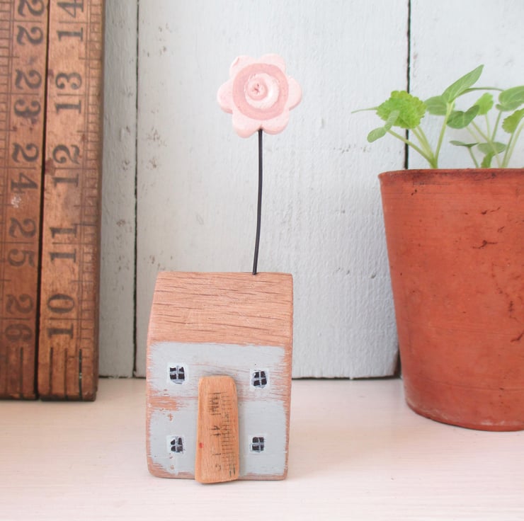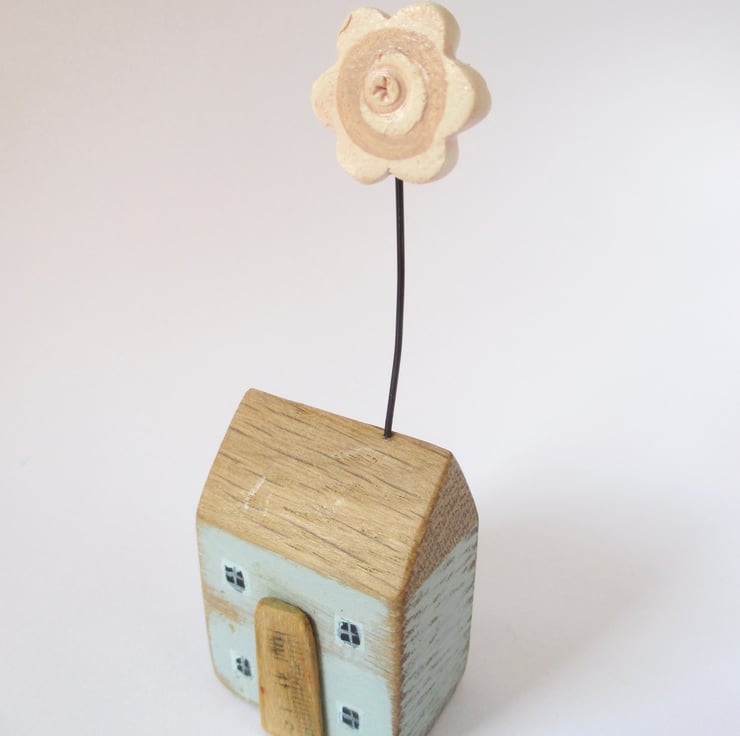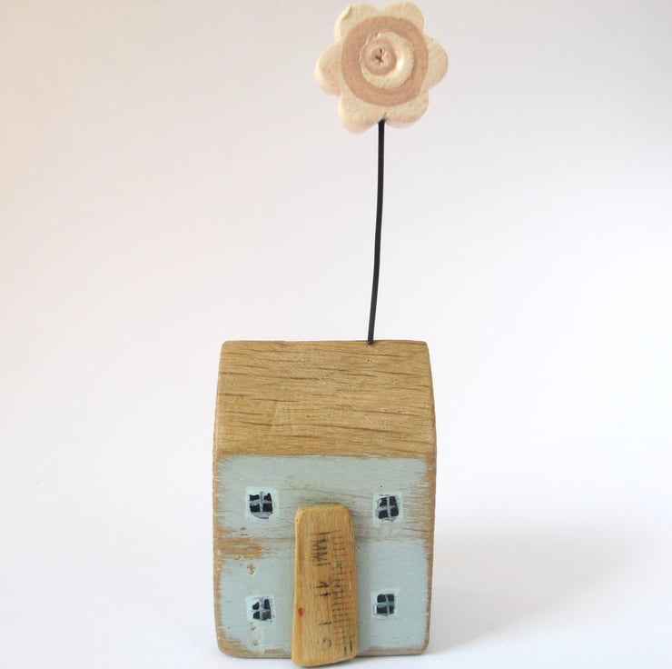 This tiny little oak wood house has been hand carved and painted. There is a clay flower sprouting from the rooftop!