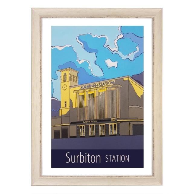 A beautiful A3 print of Surbiton's fabulous art-deco station, caught at sunset as threatening clouds rolled in, in a ‘shabby chic’ white frame.