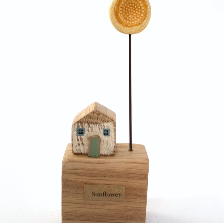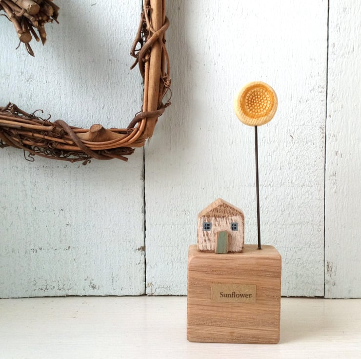 This tiny little oak wood house has been hand carved and painted. There is a clay sunflower growing tall beside it.