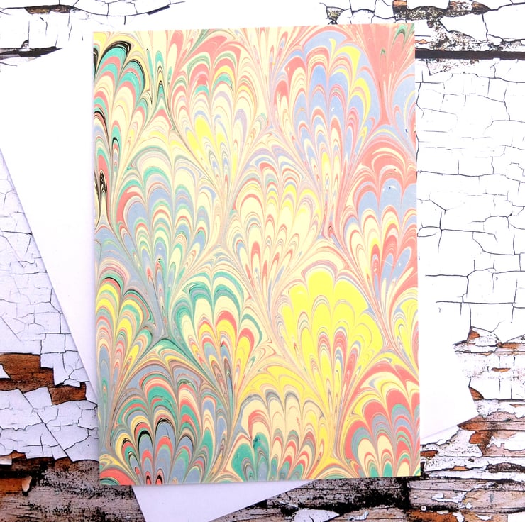 This lovely and unique marbled note card was made by me in the Lincolnshire wolds. The multicoloured design is a traditional bouquet or peacock pattern.