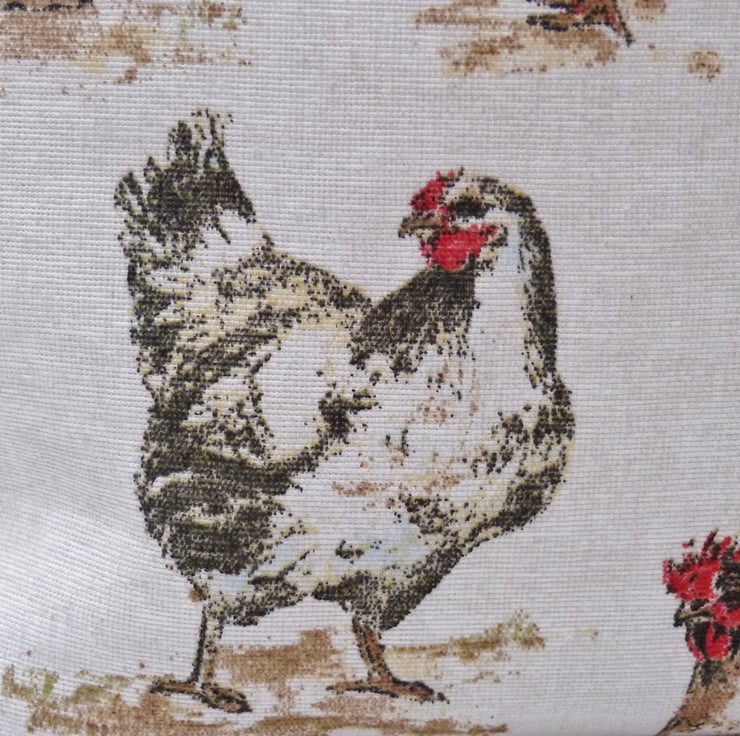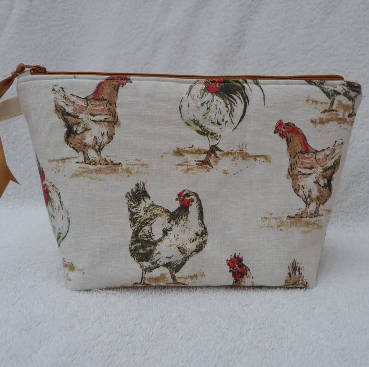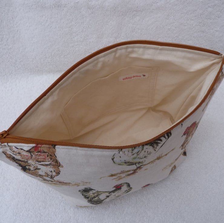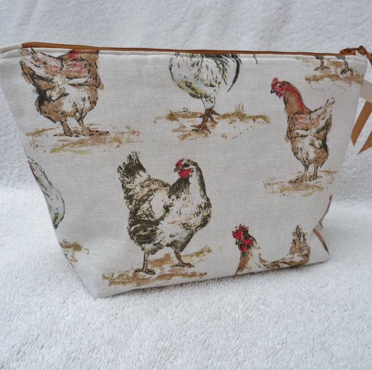 This fabulous holdall has been created from a lovely chicken print cotton fabric. It is fully lined, with wadding to give structure, and has an internal pocket. The pouch has a squared off base to make it really nice and roomy, and free-standing.