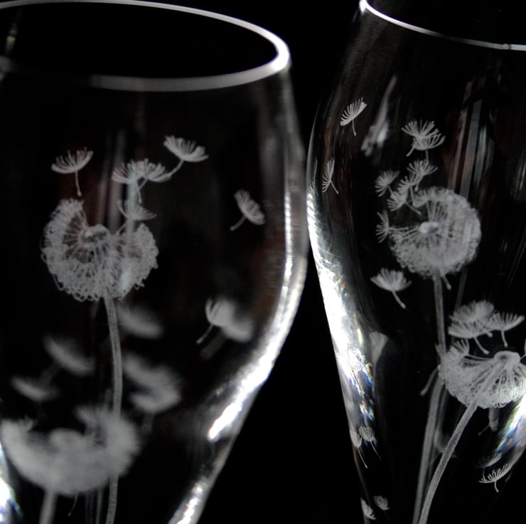 Hand engraved lead-free crystal glasses. I have hand engraved dandelions onto each glass using a selection of stone and metal burrs.