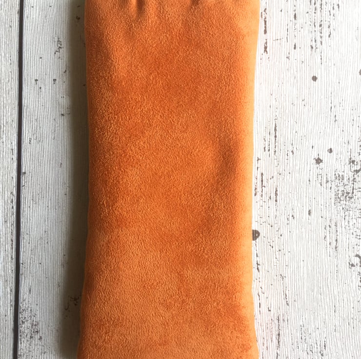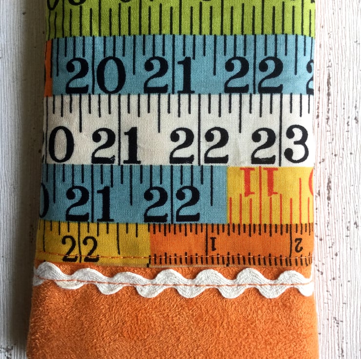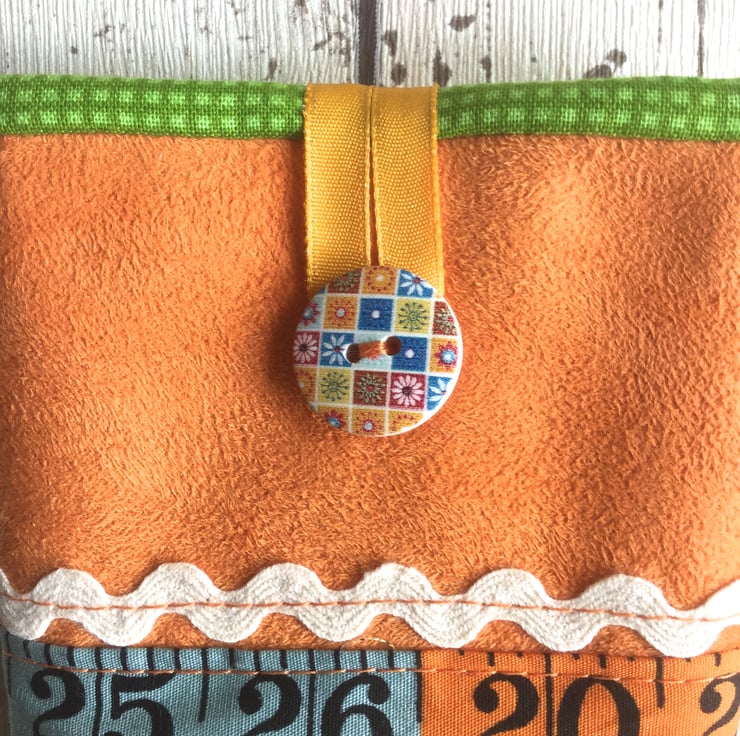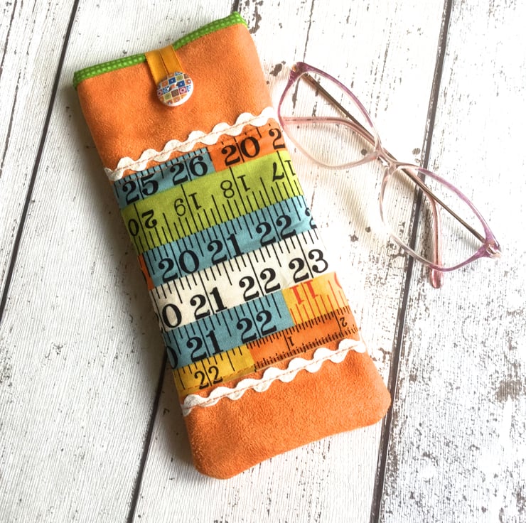 This citrus orange faux suede glasses case pops with zingy colour. The cotton fabric front panel in a tape measure design is in shades of lime green, deep yellow, pale blue and white and is decorated with a line of cream rick rac either end. The back of the case is plain. A button with a mosaic pattern echoes the colours of the main case and an orange ribbon loop complete the piece.
