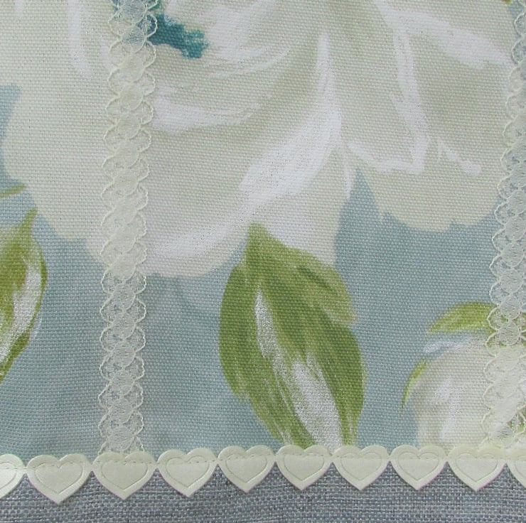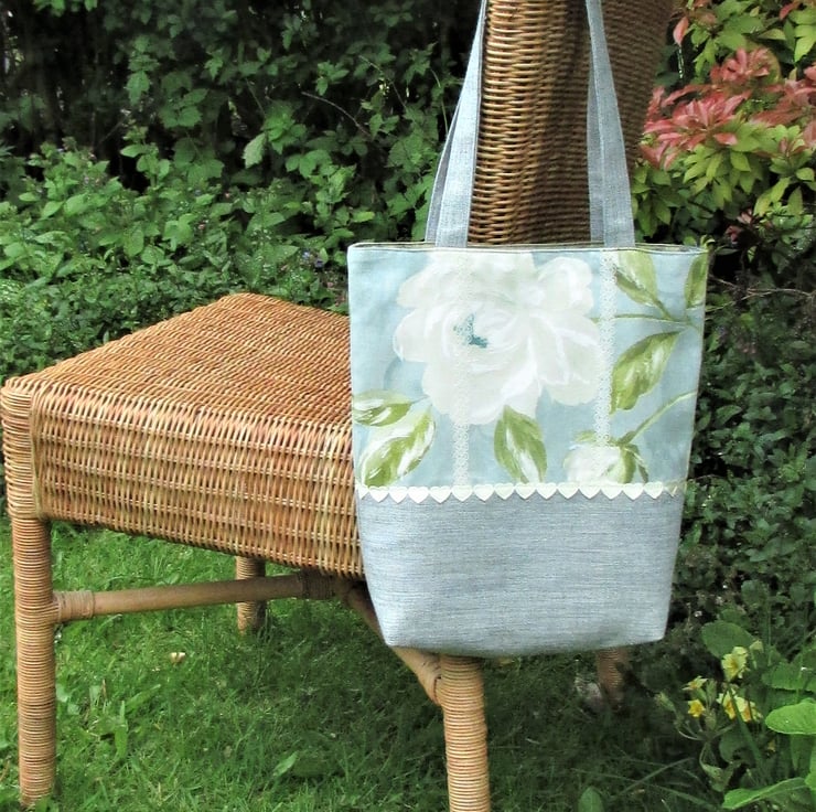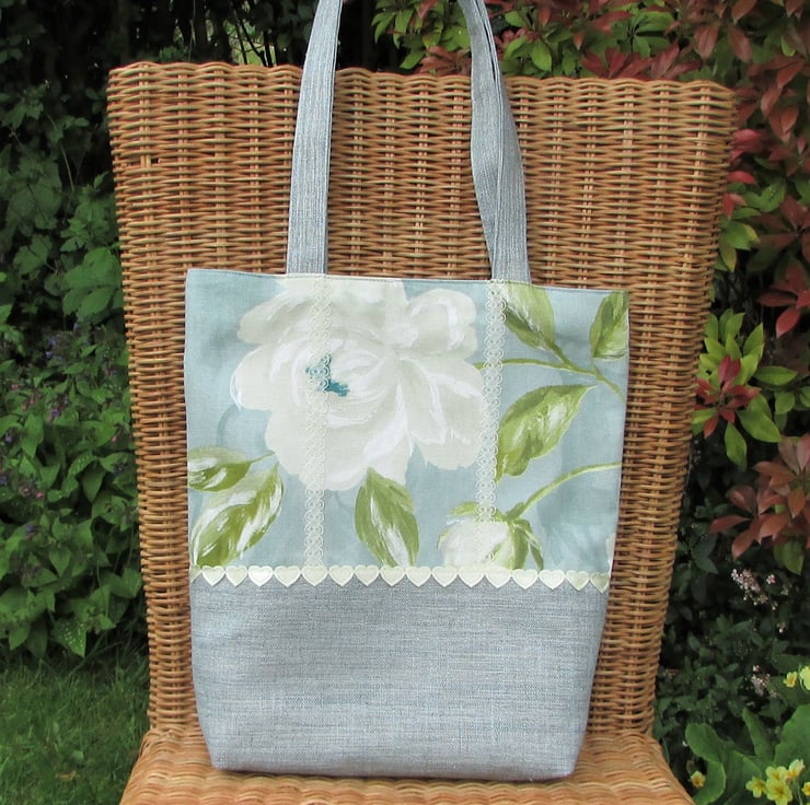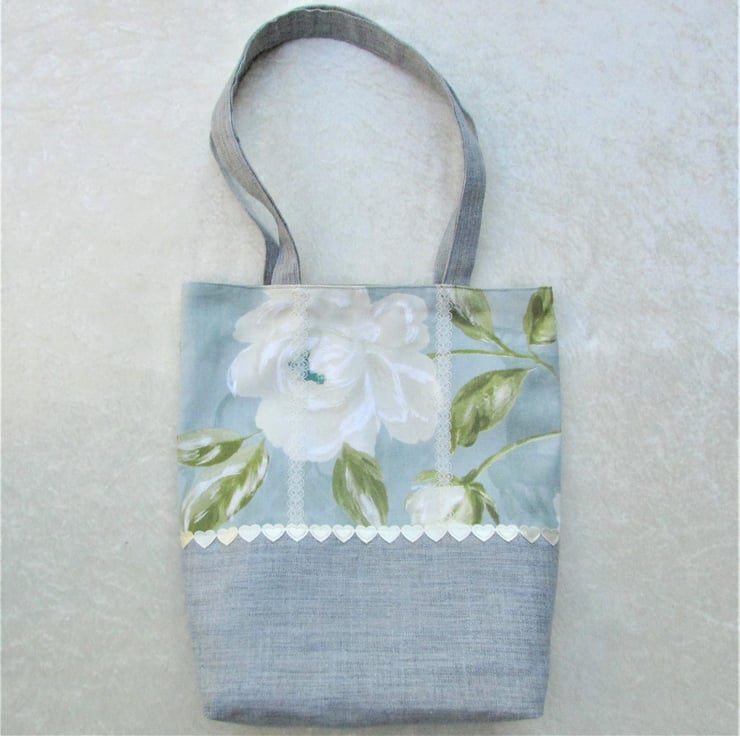A pretty tote bag in two lovely co-ordinating fabrics. The upper part of the bag is a pretty print fabric featuring large white Peony flowers and green leaves on a duck egg blue background. The lower part of the tote bag and the handles are made from a plain duck egg blue fabric. Along the join of the two fabrics, the bag is embellished with a ribbon of pretty cream satin-finish hearts. The upper floral section is also embellished with cream lace which divides the floral panel into three sections. The trim is present on both sides of the bag. The tote bag is lined with sage green fabric which matches the colour of the leaves on the floral panel.