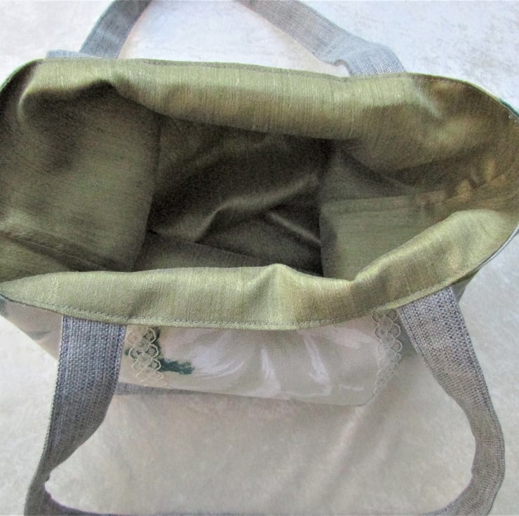 This is very a versatile tote bag - pretty enough to be used as a handbag. The pretty floral print, complementary colours and the lace and satin trimmings give this bag a very luxurious and romantic feel and it would be suitable for a special occasion such as a wedding. It would also make a lovely gift.