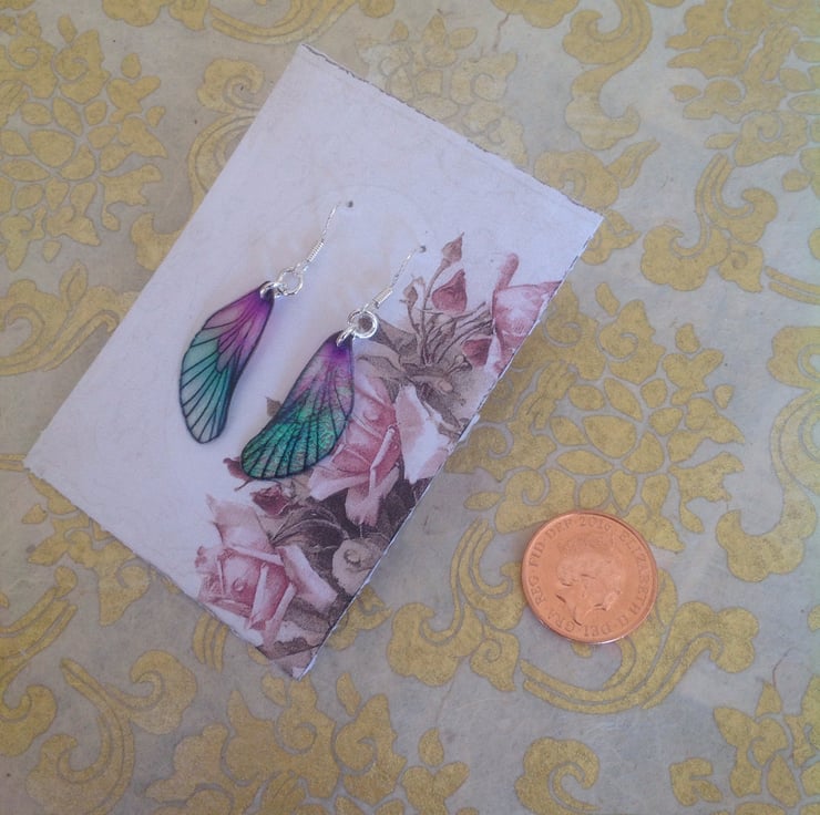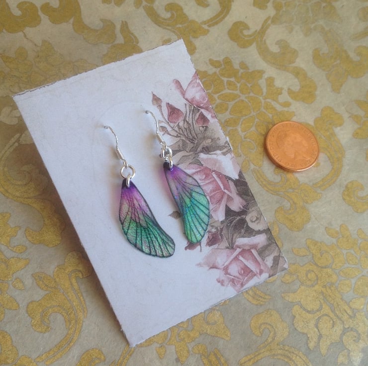 Pretty purple and green fairy wing earrings.