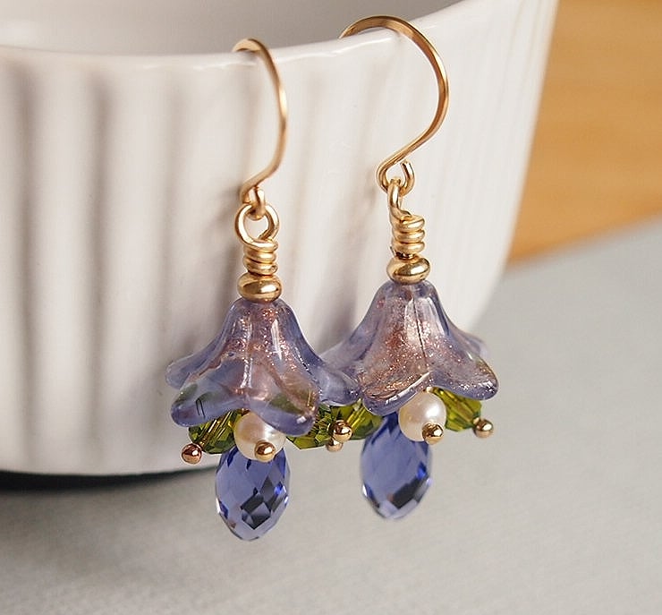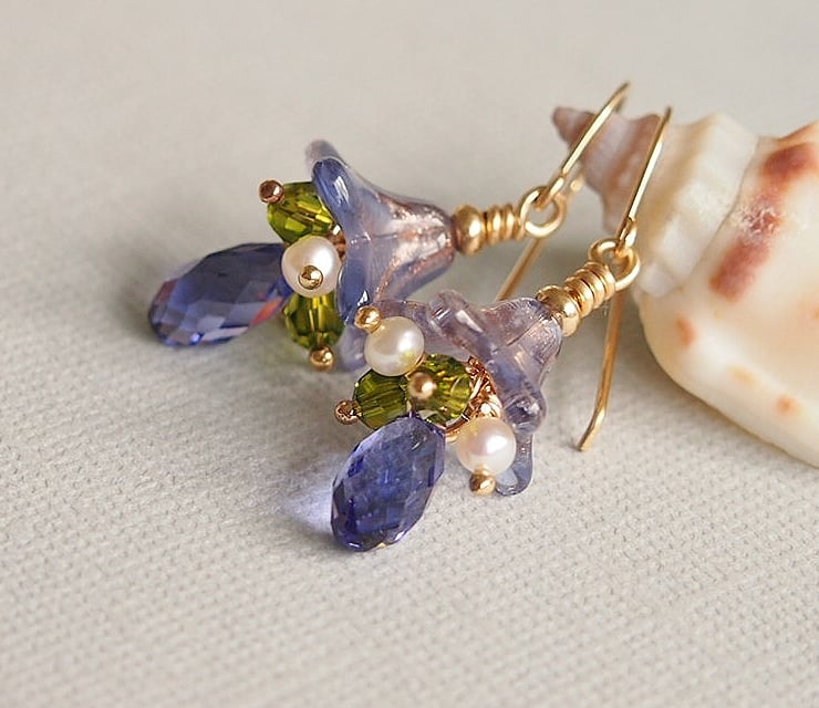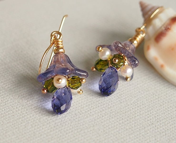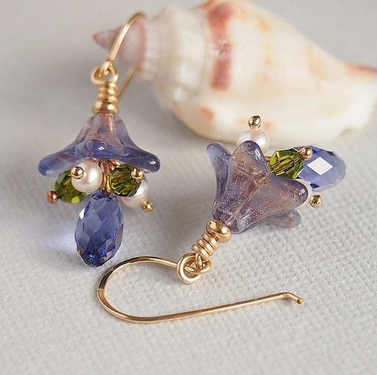 Gorgeous earrings featuring vintage style mauve glass flower beads. From the centre of the flowers is a cluster of Swarovski crystals and freshwater pearls. These earrings are dainty and feminine and have been completed using 14kt gold filled head pins, beads and ear wires I made especially for these earrings.