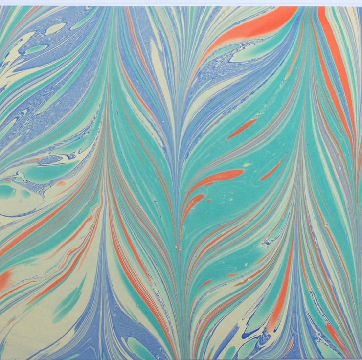 Featuring a genuine piece of my marbled paper in a traditional pattern known as a gelgit (Turkish for back and forth or coming and going). It is one of the simpler patterns to produce, but none the less a striking one. I've used a bold but simple colour palette of orange, blue, cream and turquoise.