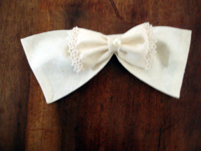 Is it dark ivory or cream? This silk double hair bow is sewn onto a metal hair slide and hand decorated with some tatting on the edges as well as a pearl effect button sewn to the middle of the bow. I made this bow from Eri silk. It is an Indian wild silk that is quite unusual and eco - see inspiration. This silk weave is quite smooth and has a little crispness to it.