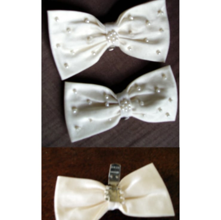 There is a shoe clip sewn to the bag of each of the bride bows so that the shoe decoration can clip easily and firmly onto the front or back of a shoe.