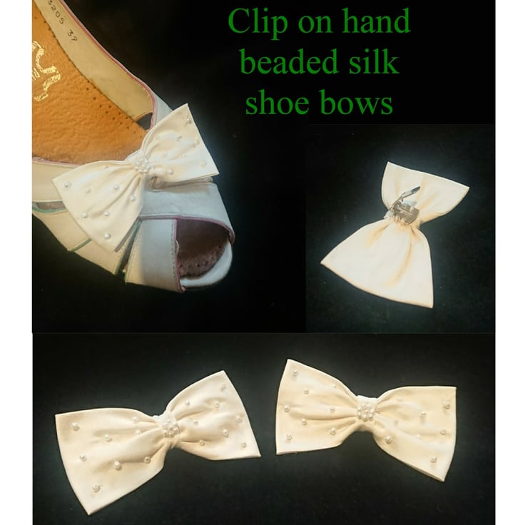 A pair of ivory silk handmade shoe bows that are scattered with imitation pearl beads. All my products are hand sewn and the ivory pearl type beads are also sewn by hand. onto these ivory shoe bows. The silk is 100% Thai silk.