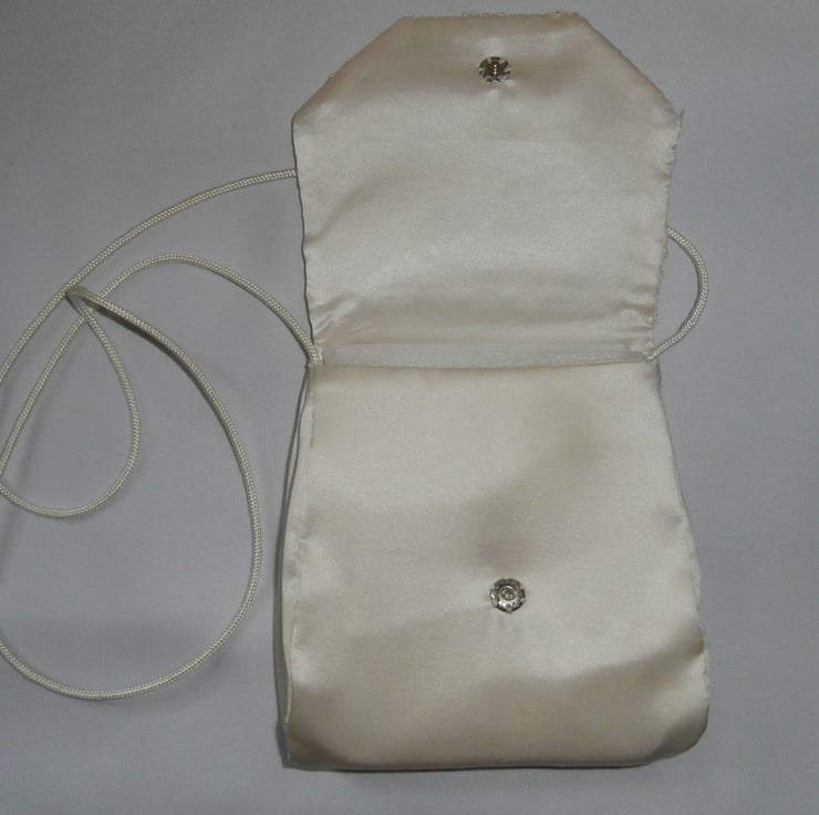 Ivory silk satin wedding pochette bag for a bride with an overlay of corded lace on the back of the silk bag and on the front flap. The handmade silk and lace bridal bag is hand sewn and fastened with a metal popper under the flap. As this shoulder bag is made from 100% silk heavy weight crepe back satin the ivory bag is quite soft.