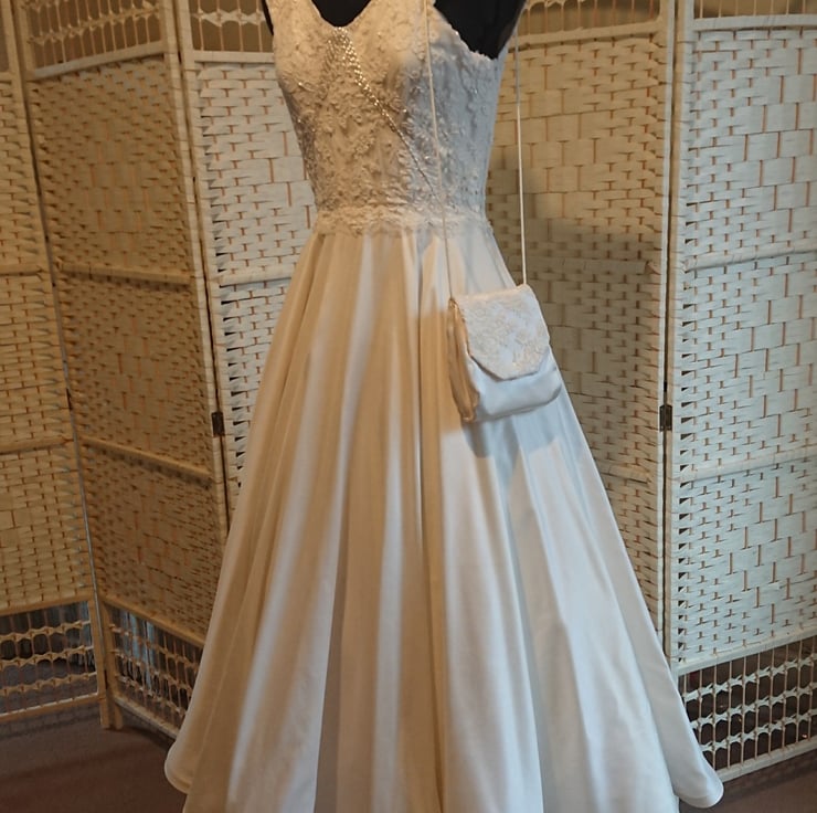 The silk and lace hand beaded ankle length wedding dress in the last photo is also for sale. Message me for details. The lace on the bodice of the dress matches the lace of the bag.