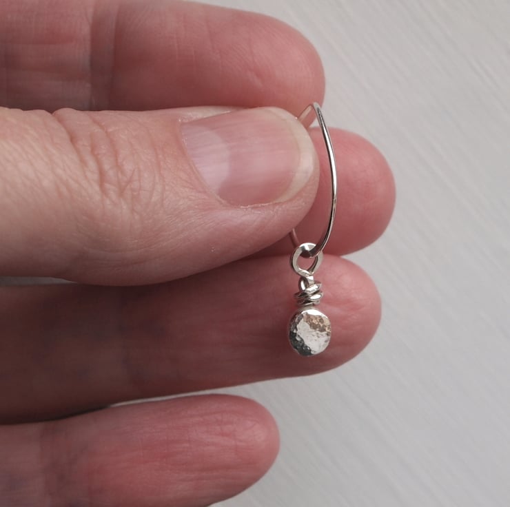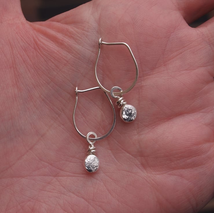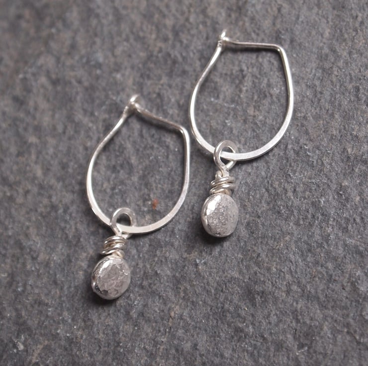 Little pebbles of recycled silver hang by a twist from horseshoe ear wires to form these great little everyday earrings. The silver pebbles have been hammered to add texture and sparkle and the earrings have been burnished to give them a bright shine.