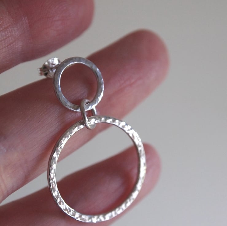Hammered hoops of sterling silver have been connected together with a small ring to form these stud earrings. The hammered texture catches the light beautifully making the earrings shine as they twist and move. These earrings are entirely made by hand using sterling silver and come with sterling ear scrolls/backs.
