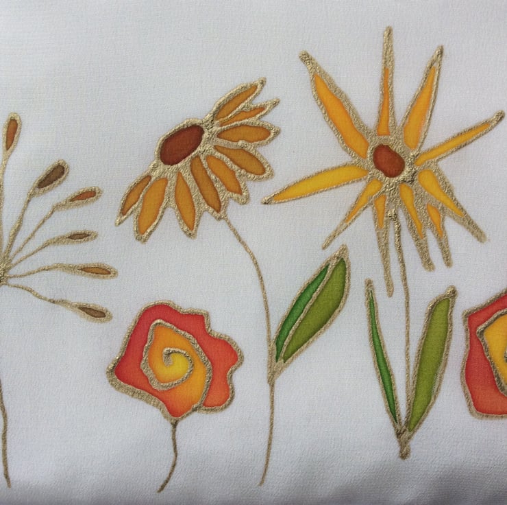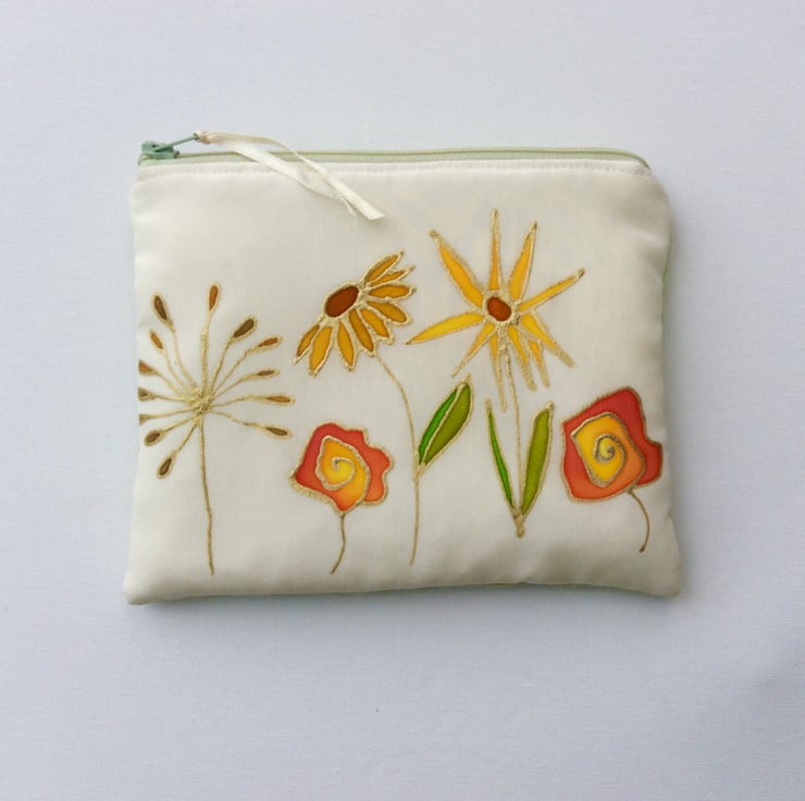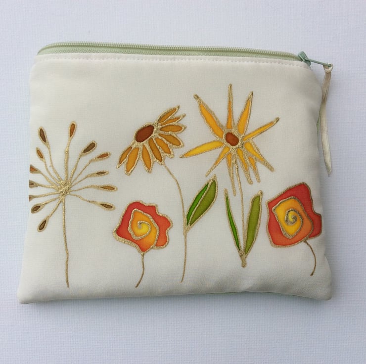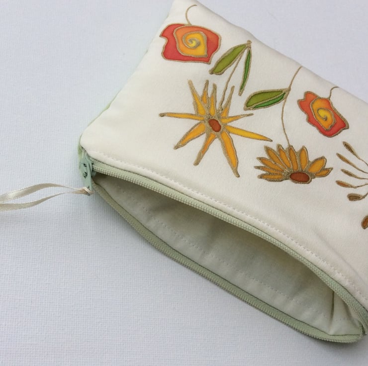 This one of a kind make up bag is made using my hand drawn and painted original design on silk. The reverse is a plain light green, linen look fabric..
