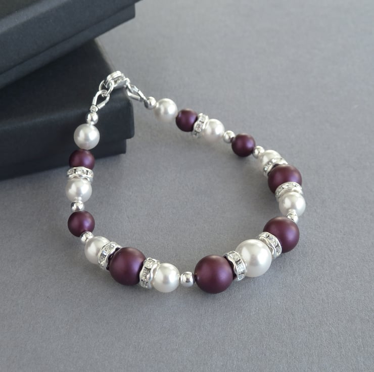 The combination of the lustrous pearls with the glittering crystals makes this plum pearl and crystal bracelet ideal for a wedding or special event. Created using aubergine and white glass pearls, round silver beads and bands of mounted crystals, this dainty bracelet would be ideal for bridesmaids in an dark purple themed wedding.
