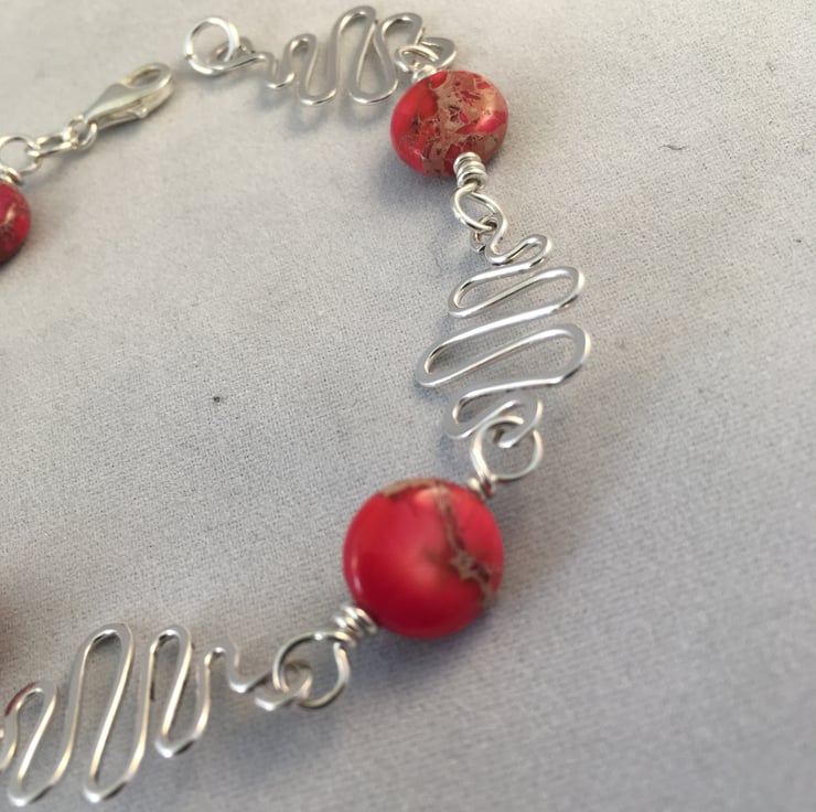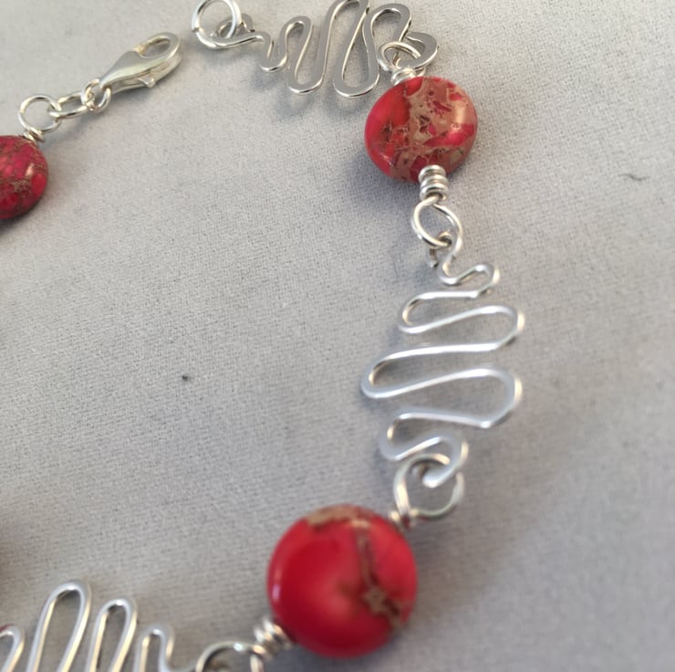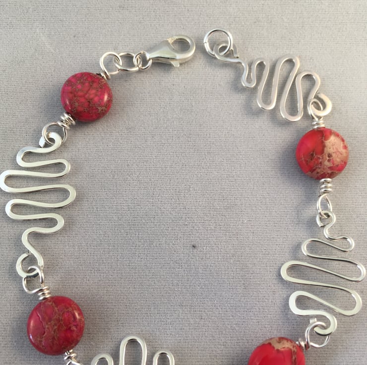 Sterling silver hammered squiggle links with red impression jade coin beads.