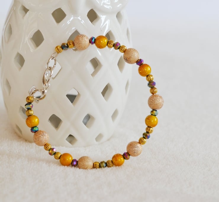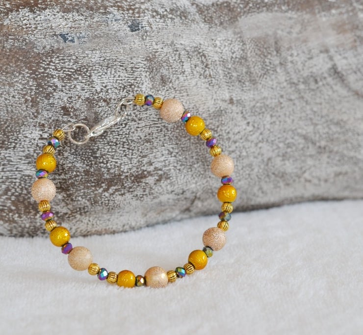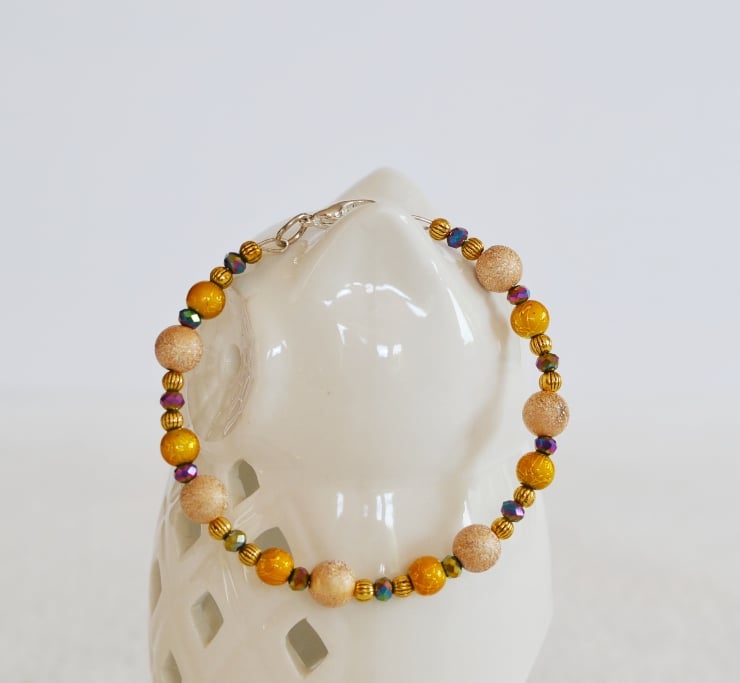Beautiful gold and crystal wire charm bracelet. I have made it using small light gold metallic glitter spacer beads, multi coloured ab crystal glass rondelle beads which go from blue, purple, gold, pink and green, tibetan gold melon beads and gold swirl patterned acrylic beads. The bracelet fits from 6" upto 6.5" wrists. It has a lobster clasp fastening. I can make this to fit larger wrists by adding extender links.