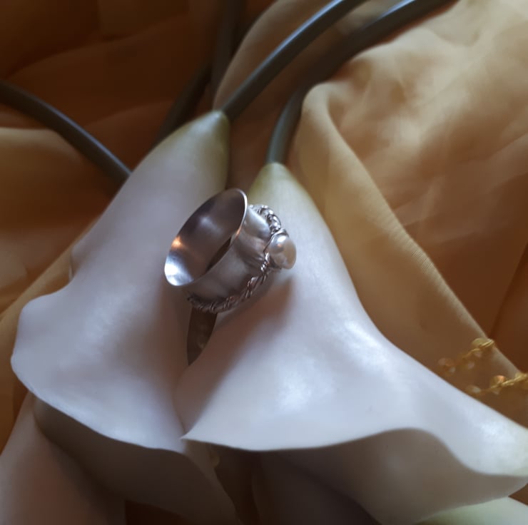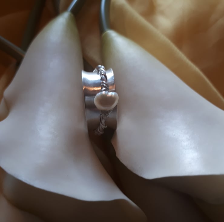 Handmade sterling silver ring. Designed for anxious fingers and busy hands. Approx 1cm high with a twisted wire band. On the band is a freshwater pearl. The main ring has a matte finish. Other gems available on request though prices might vary. Gems vary by nature. Please state ring size when ordering. Even fidgeting can be beautiful.