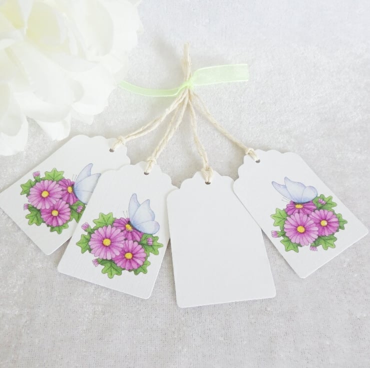 Each tag has been printed out onto good quality white linen embossed card and has a natural coloured twine attached. I have also added a little glitter detail to the butterfly wings ant the centre of the flowers. Each tag is blank on the reverse for you to write your own message.