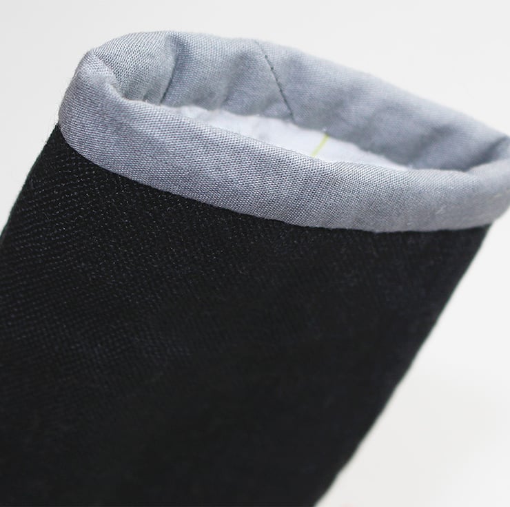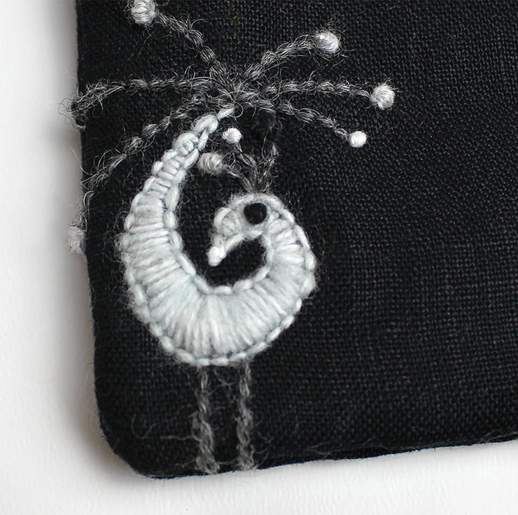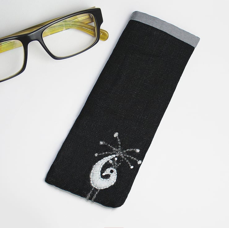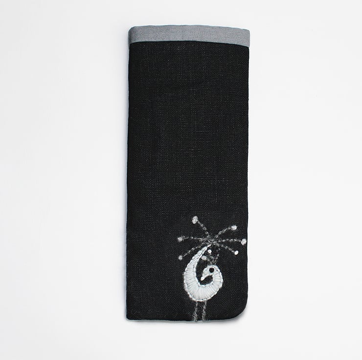 I have made the glasses case in black twill and the item is trimmed in grey poplin. On one side I have hand embroidered a monochrome peacock(called Clive) using alpaca and wool yarn. It is lined in an up cycled silk scarf. The case is wadded to protect the glasses.