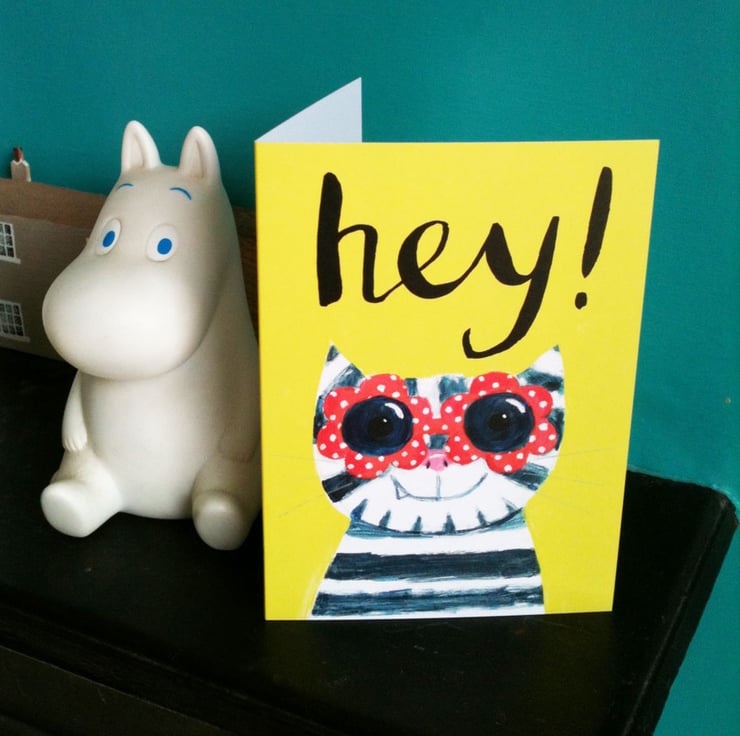a cheery cat character wearing red polka dot sunglasses on a bright yellow background. To make someone smile, or just get their attention. Digitally printed card on FSC approved paper from an original acrylic painting by Jo Brown