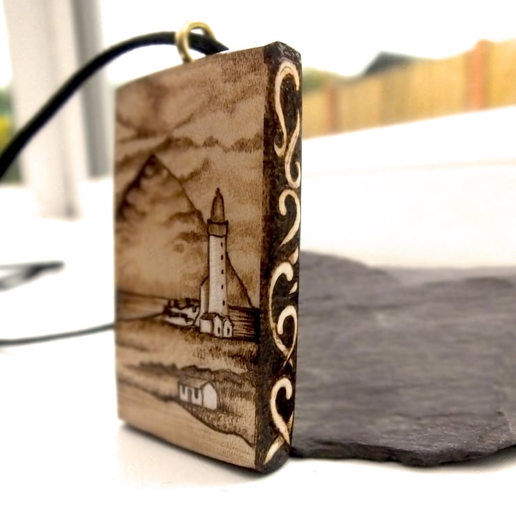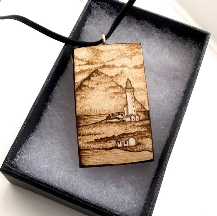 A tranquil lighthouse scene picturing Pladda lighthouse, and Aisla Craig in the distance. The design is achieved using free hand wood burning or pyrography, decorated on all edges and sides except the reverse, which I have initialed, SB for Sarah Bell.