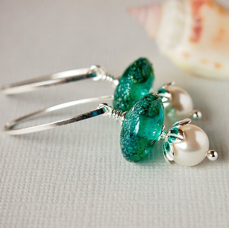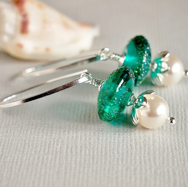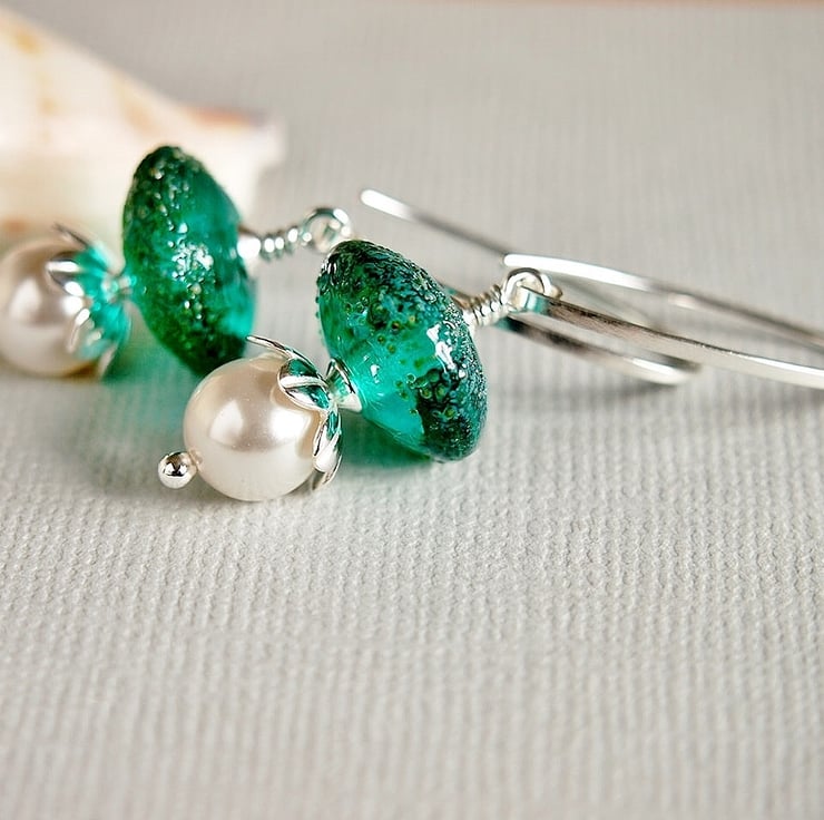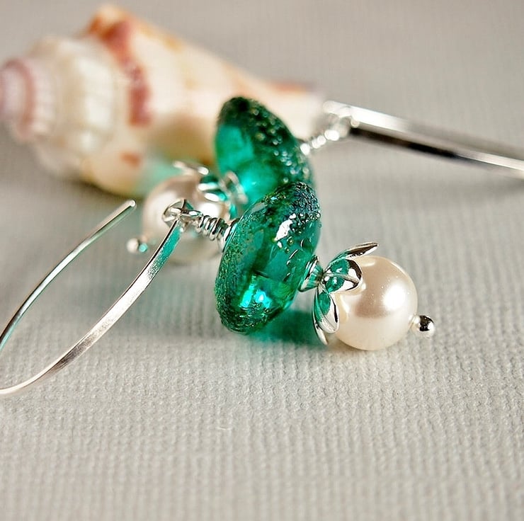 These beautiful lampwork glass beads, handmade by UK glass artisan Josephine Wadman, are a teal blue green disc shape with surface detail in silvered glass which shimmers gently. I have complimented these lovely beads with 8mm Swarovski crystal pearls and sterling silver flower bead caps and finished using sterling silver beads, headpins and ear wires.