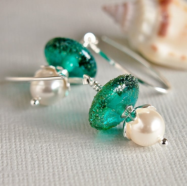 These beautiful lampwork glass beads, handmade by UK glass artisan Josephine Wadman, are a teal blue green disc shape with surface detail in silvered glass which shimmers gently. I have complimented these lovely beads with 8mm Swarovski crystal pearls and sterling silver flower bead caps and finished using sterling silver beads, headpins and ear wires.