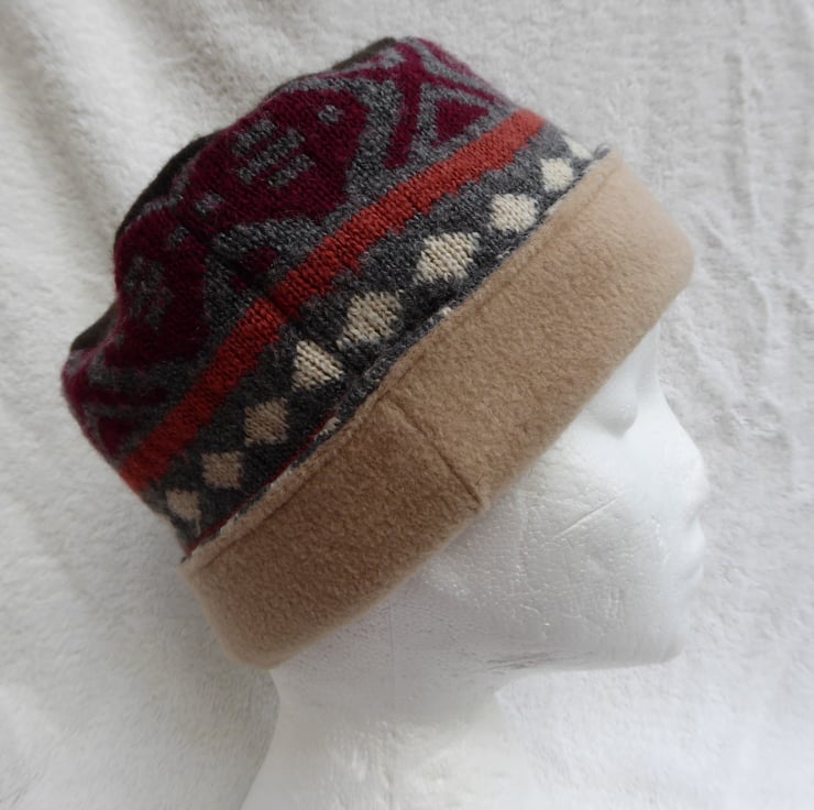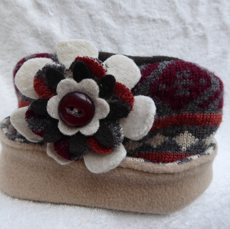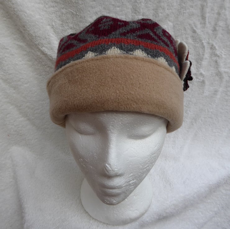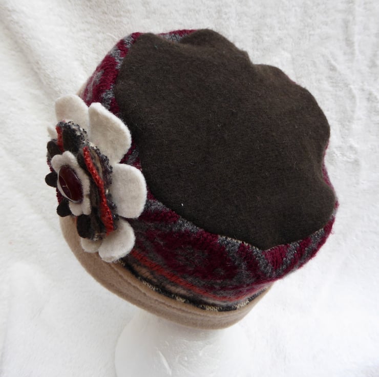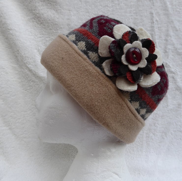 This stylish hat has been re-fashioned from up-cycled wool sweaters. The jumpers have been washed and felted before stitching. A full lining for the hat has been made from polyester polar fleece for warmth and comfort. The brim folds up to show the fleece lining. A decorative felt flower with button center has been pinned to the brim of the hat with a safety locking clasp, so is removable.