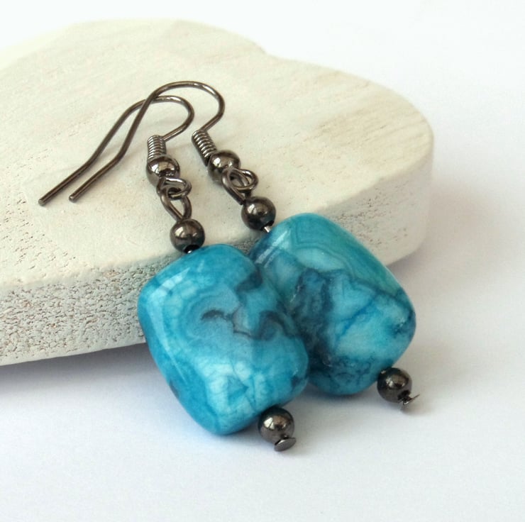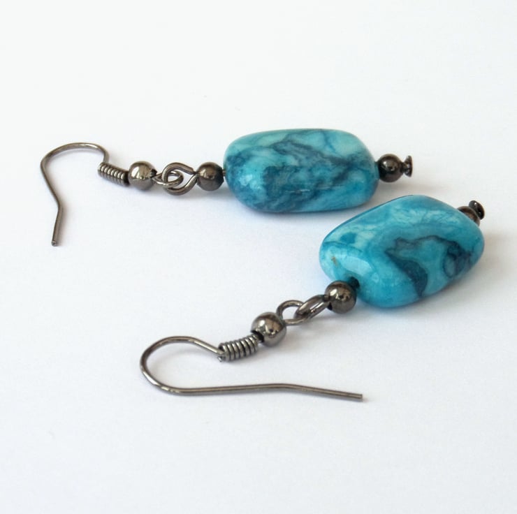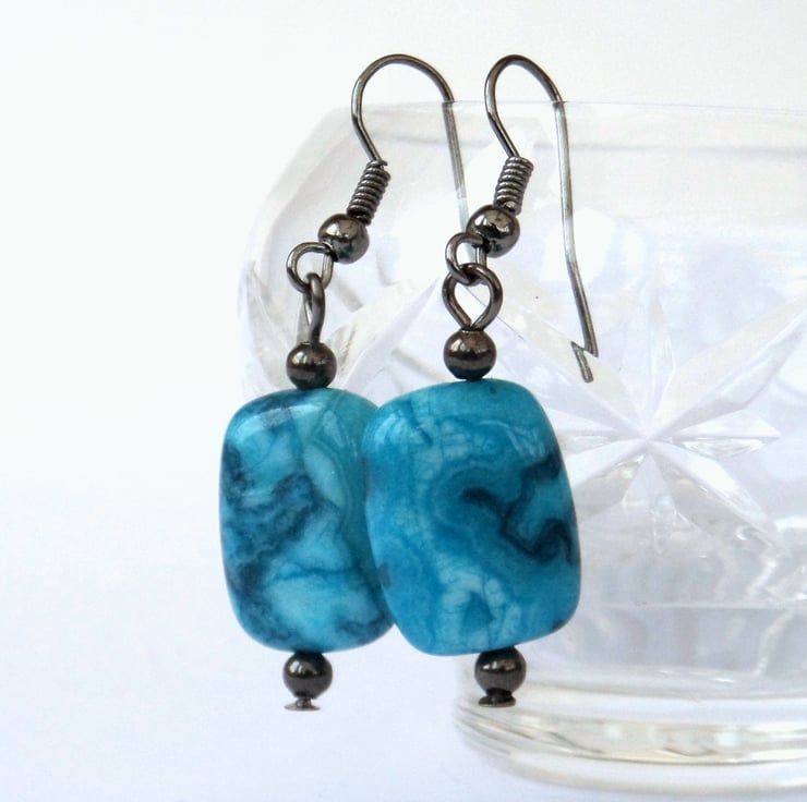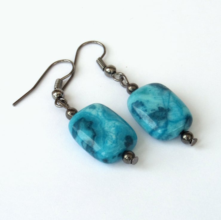 Blue crazy agate rectangles hanging from gunmetal earring wires make a great pair of earrings.