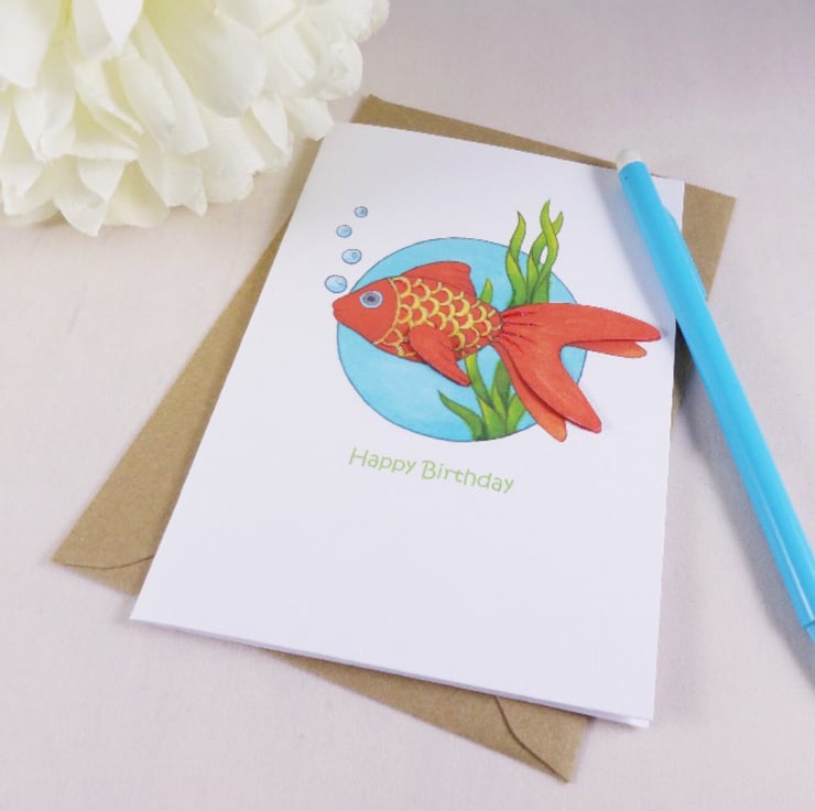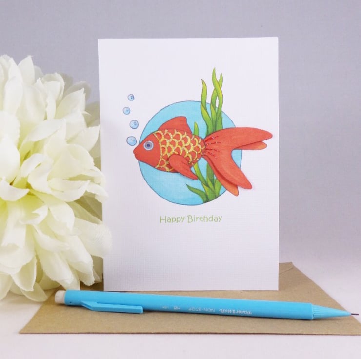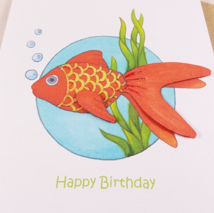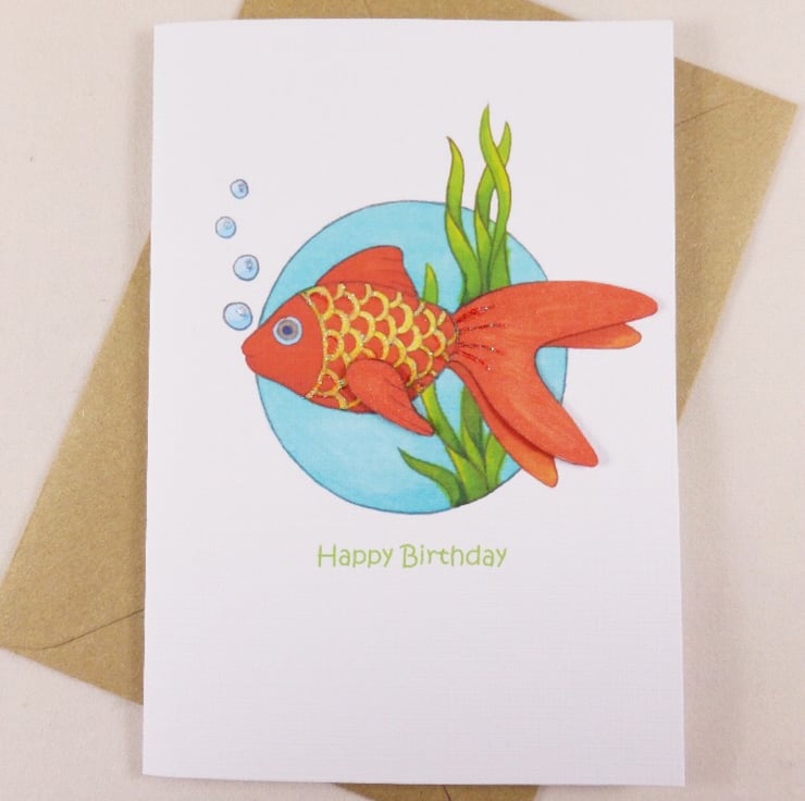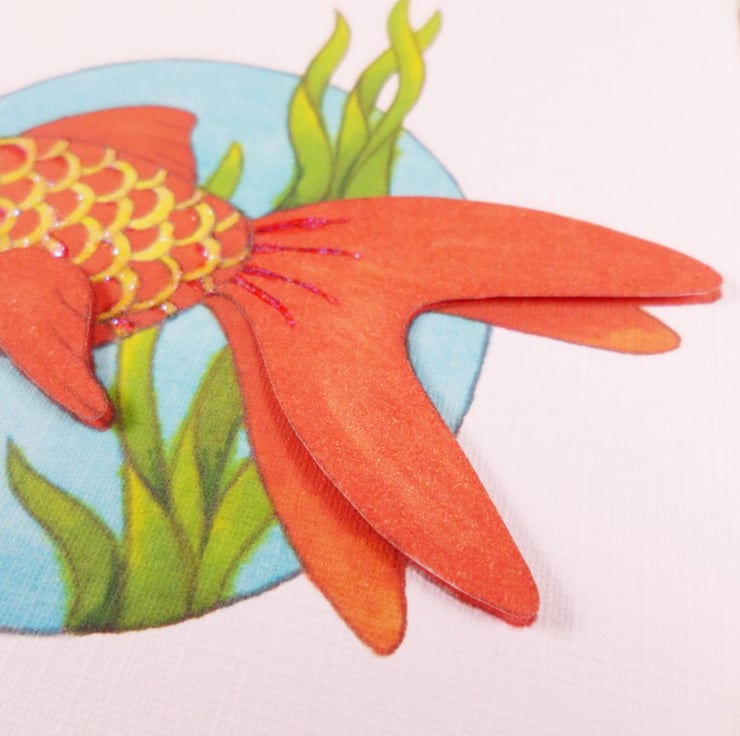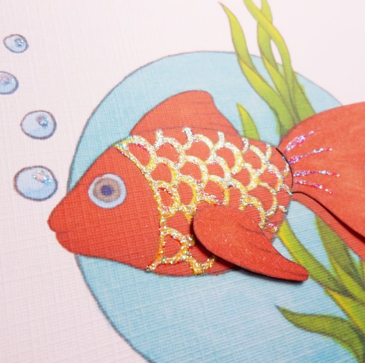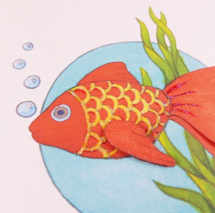 This colourful 'goldfish' greetings card has been designed using my own original watercolour illustration. The image has been printed out onto good quality white linen embossed card and then decoupaged up in parts. I have also added a little glitter detail to the goldfish scales and bubbles.