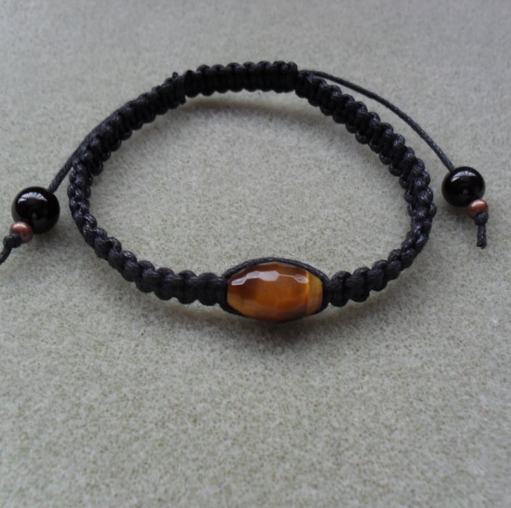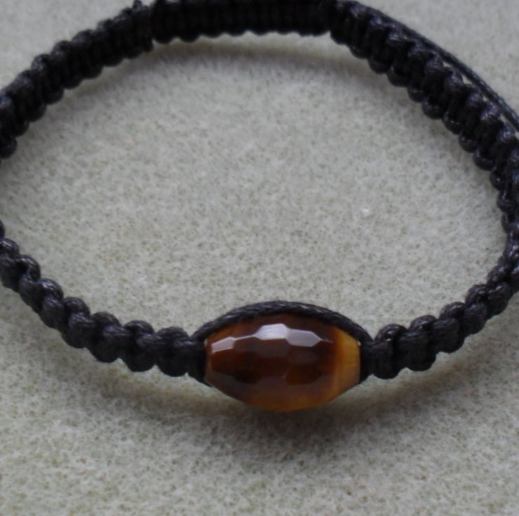 Tigers eye semi precious gemstone macrame knotted bracelet with a black cotton cord .