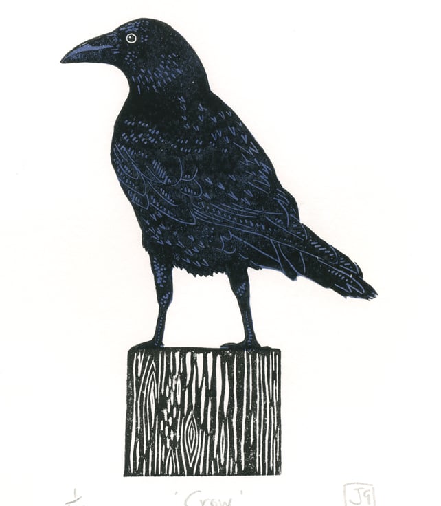 A 2-colour hand-printed linocut entitled 'Crow'.