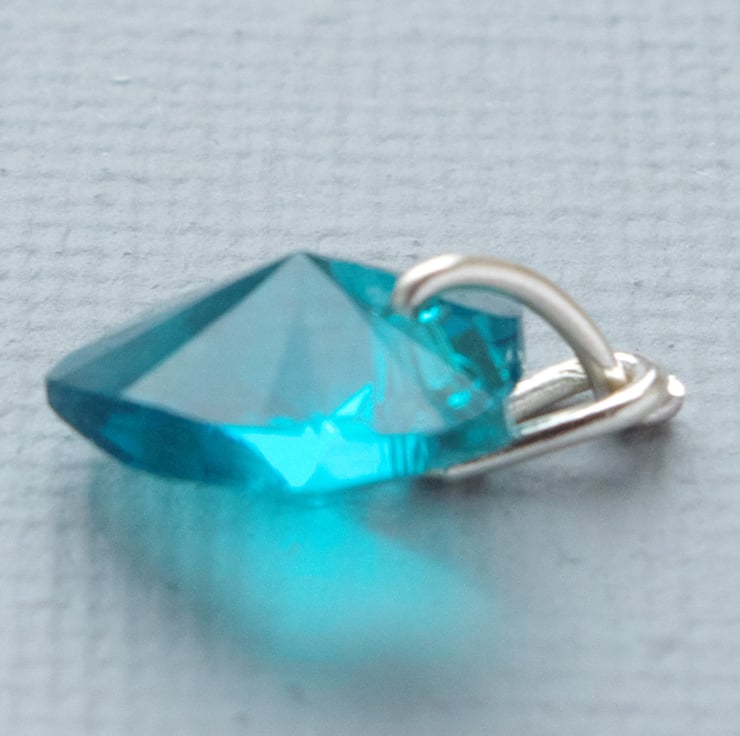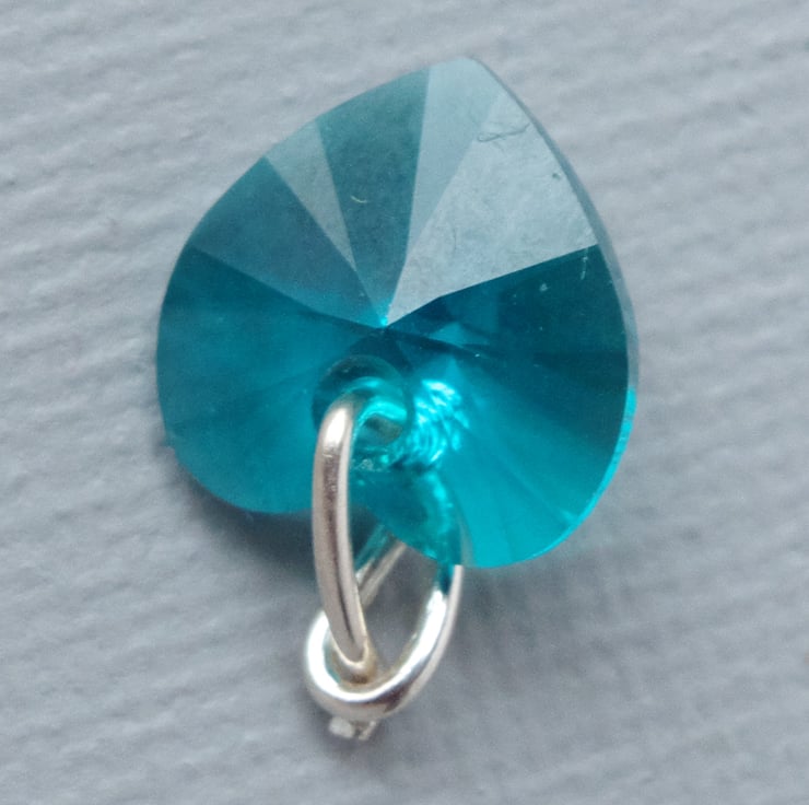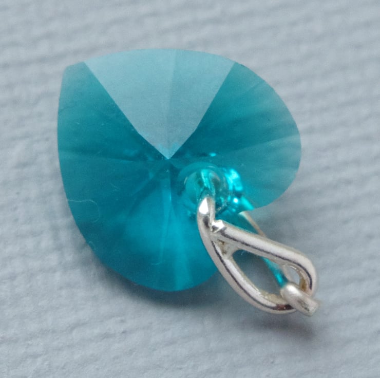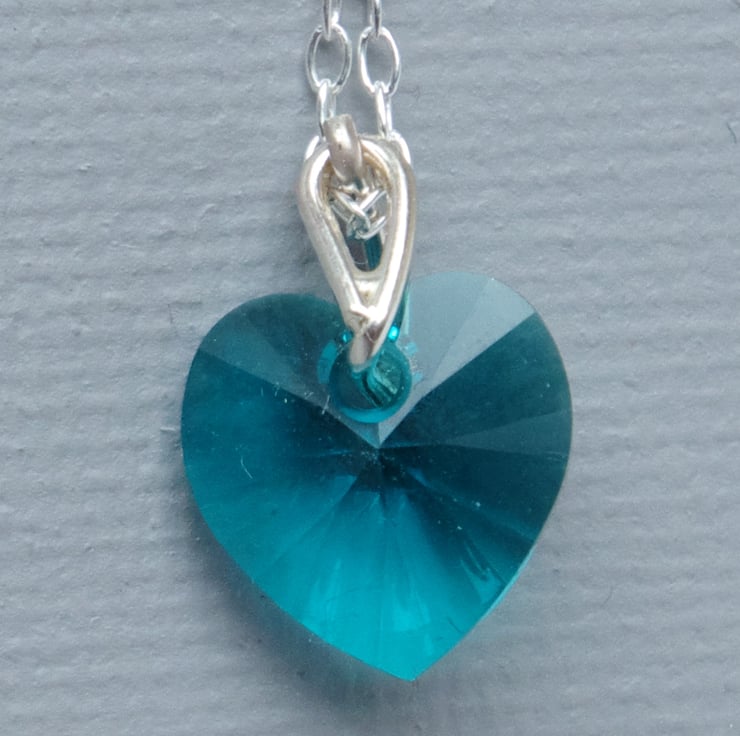 This teal or sea green crystal heart is mounted on my very own design of sterling silver bail, hand crafted by me at my Sussex workshop. The 10 mm crystal is of the finest quality, having been made by the famous Swarovski factory in Austria and would make an ideal thank you gift for your best friend on your wedding day. This colour is described as "blue zircon" and is a bright blue green, slightly more intense than a teal colour and darker than a sea green. The pendant is mounted on a 450 mm sterling silver (marked 925) trace chain fastened with a bolt ring clasp. It is presented in its own gift box, decorated with a bow.