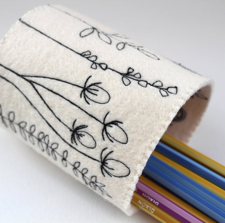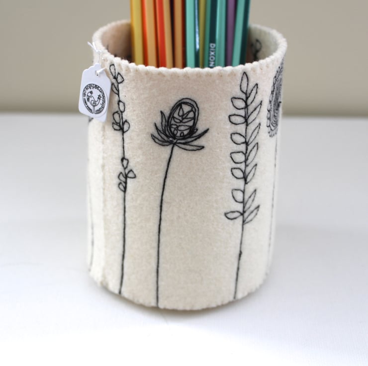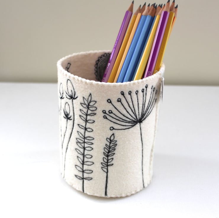 A unique 100% felt pen pot, adorned with sewn flora including seed pods, leaves and twigs.