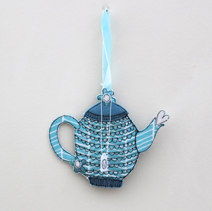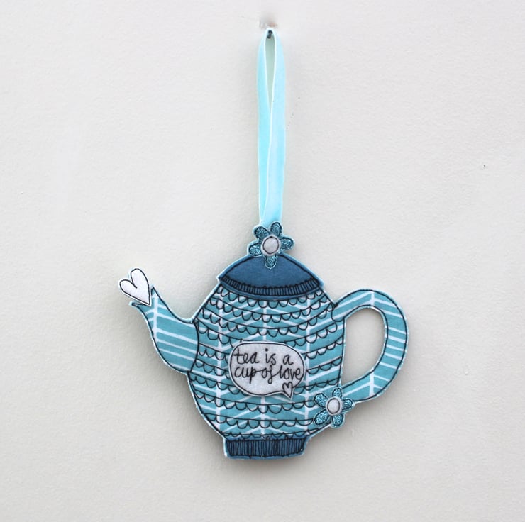 'tea is a cup of love' teapot is handmade using turquoise fabric printed with white lines, sewn scolloped lines, a 100% wool felt fabric lid and base, two glitter fabric flowers, a sewn 'tea is a cup of love' label and a turquoise velvet ribbon to hang.