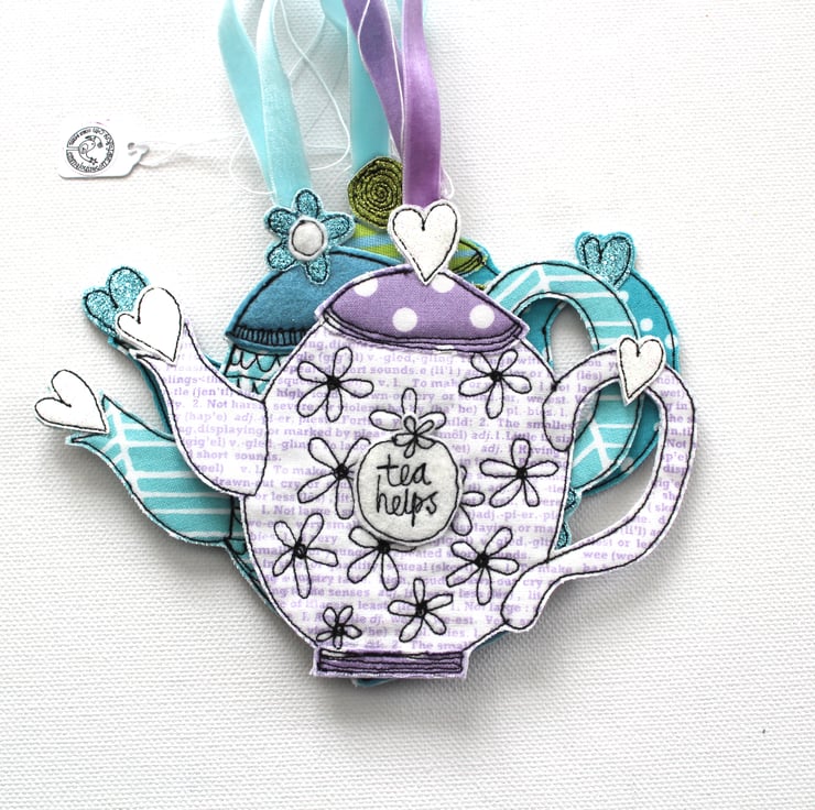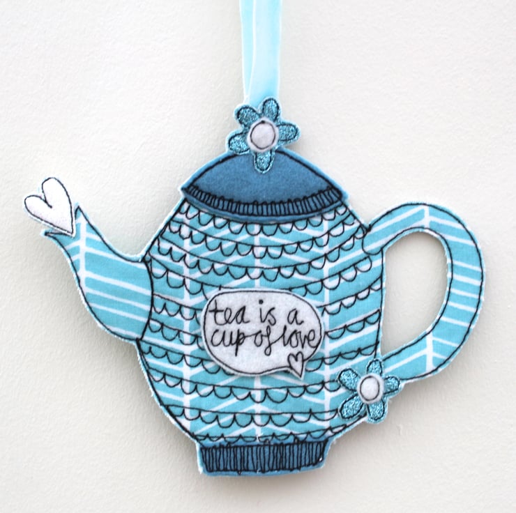 Hang this delightful fabric tea pot near your kettle, so each time you make a pot you can read 'tea is a cup of love'!