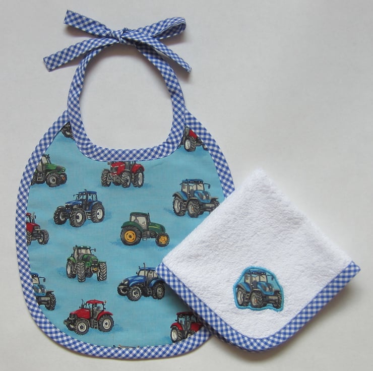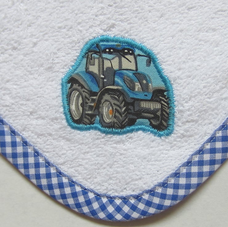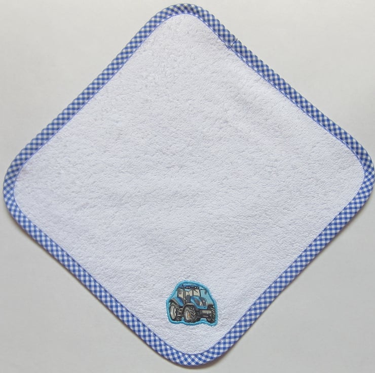 White towelling face cloth with appliqued blue tractor and edged with blue gingham bias binding.