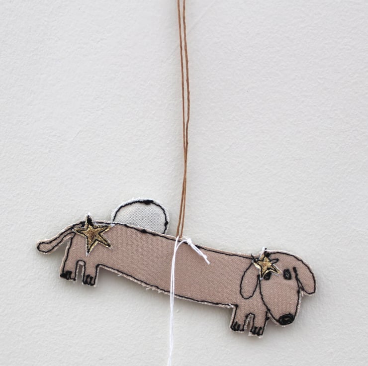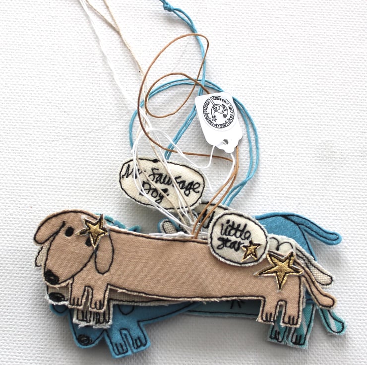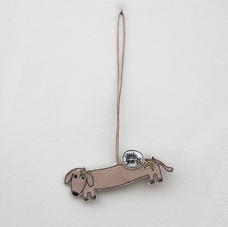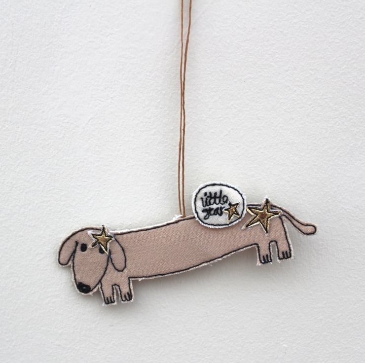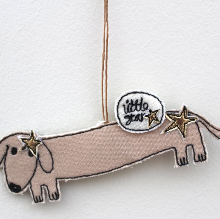 A sewn fabric sausage dog, with two sewn golden stars, a sewn fabric label 'little star' and a complementary linen string to hang your decoration.