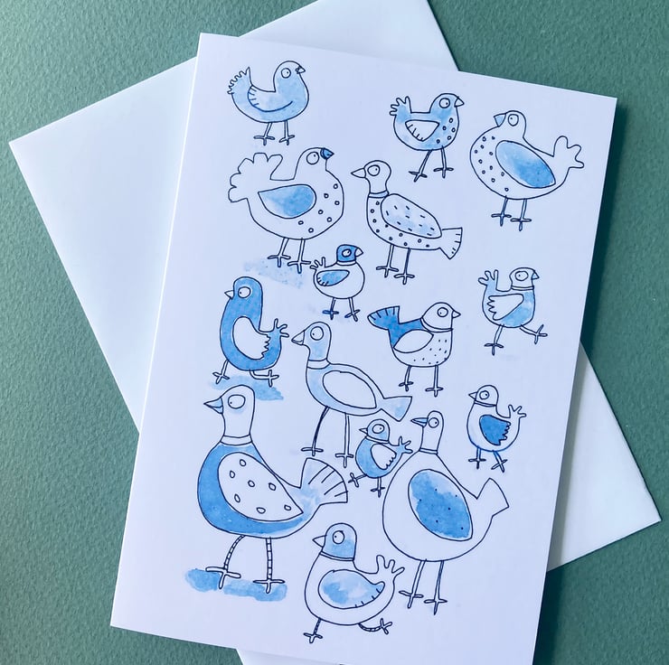 Funny blue pigeons card, blank inside, white envelope, from and original watercolour artwork by Jo Brown