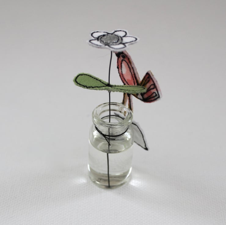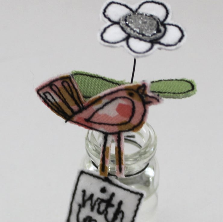 The flower and leaves are created using sewn fabric with a wire stem holding them in position in acrylic water. Satnding next to the flower is a fabric birdie and around the bottle neck hangs a sewn fabric label saying 'with love'.