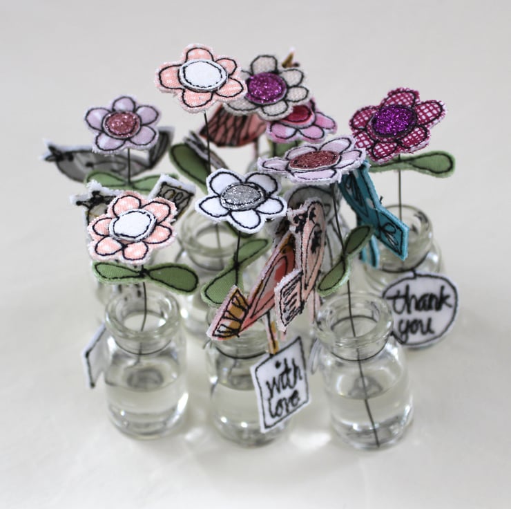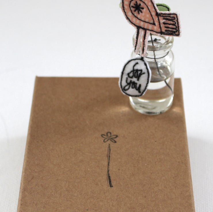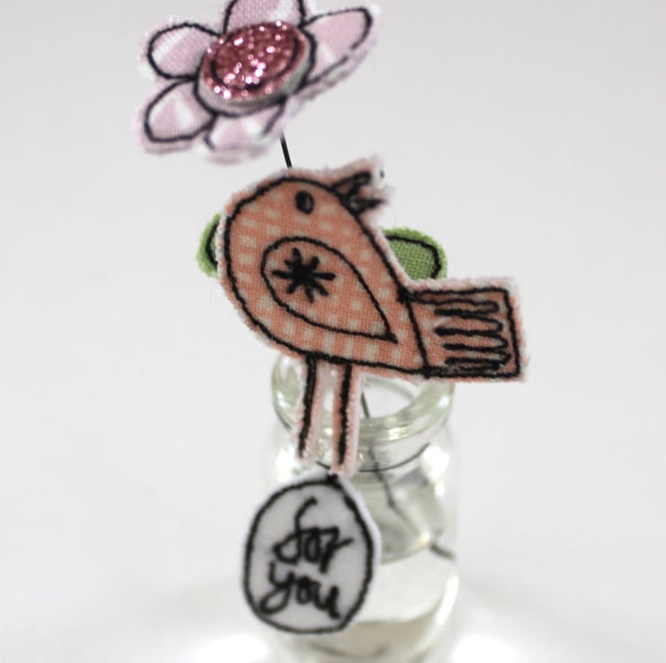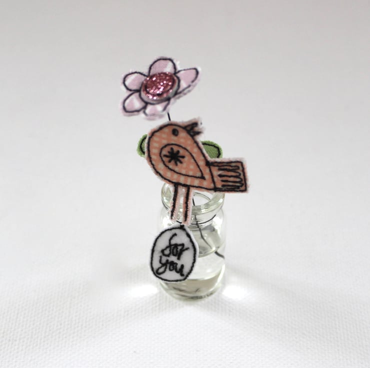 The flower and leaves are created using sewn fabric with a wire stem holding them in position in acrylic water. Satnding next to the flower is a fabric birdie and around the bottle neck hangs a sewn fabric label saying 'for you'.