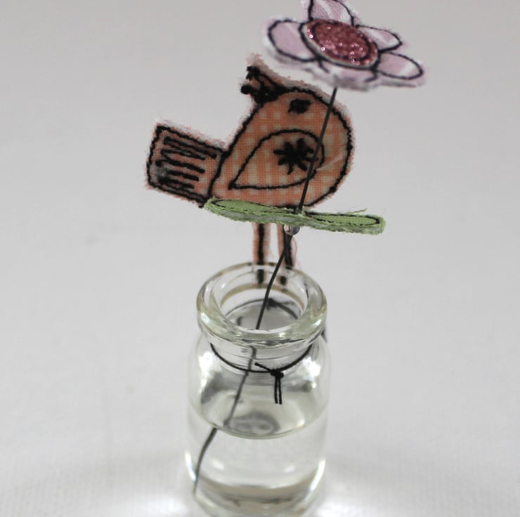 A miniature sewn fabric flower sits in a miniature glass bottle, with a little birdie by its side.