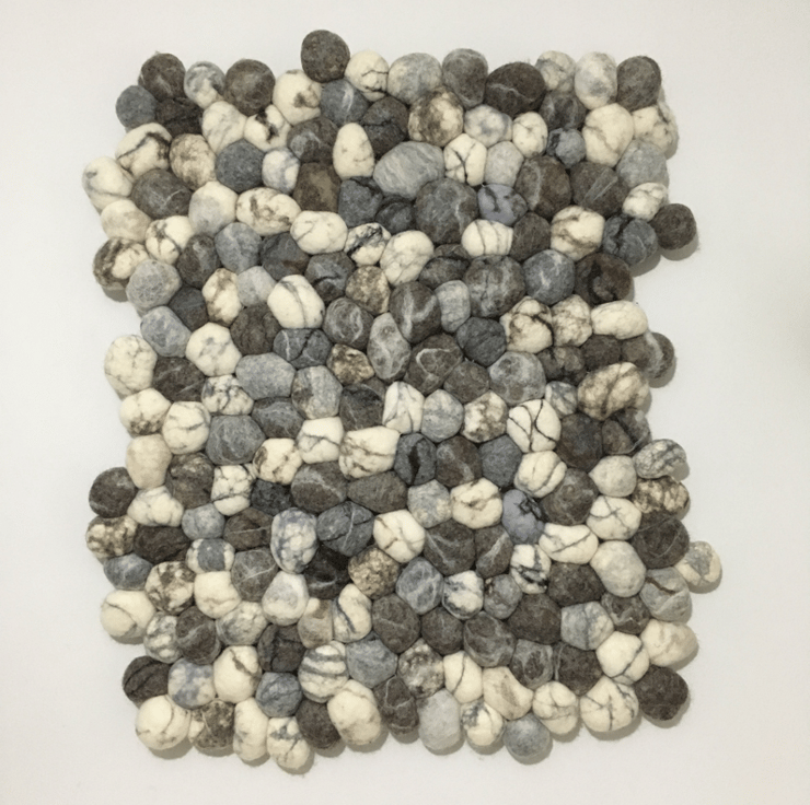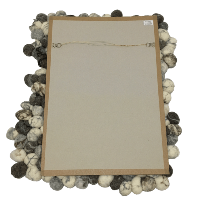 This wall hanging has been made from many individually felted pebbles stitched together to create the illusion of stones hanging on your wall. Each felted pebble is made using a lambswool core covered in wool fibres from various sheep breeds. Markings have been added and then the pebbles have been wet felted and sewn together using a strong cotton thread. It has been mounted onto a piece of board and hanging wire attached to keep the structure rigid and provide easy and secure hanging.