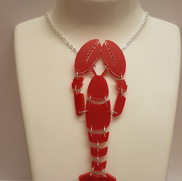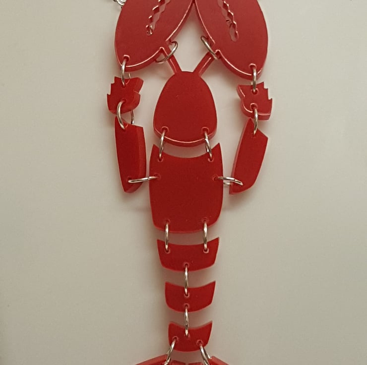 In a lovely shade of red, this necklace has been hand linked together and moves beautifully when worn. The chain is attached to the lobsters tentacles and comes up from behind the necklace when warn.