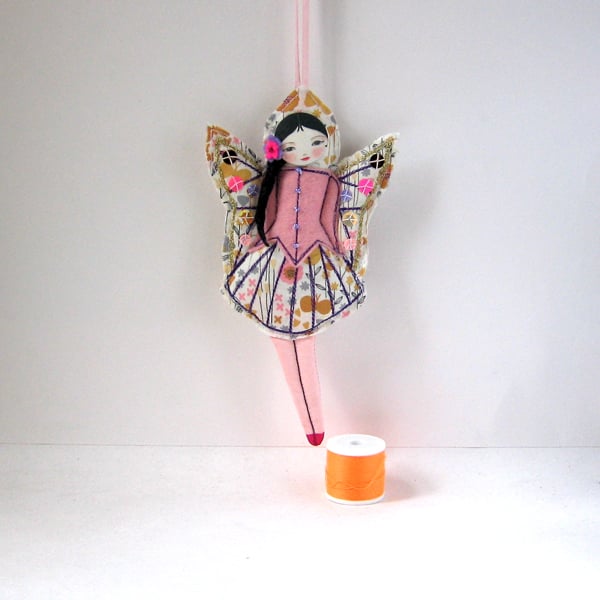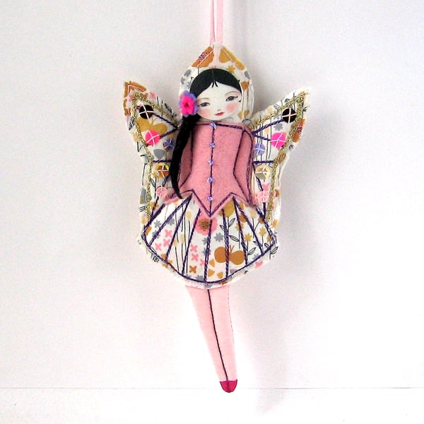 It is a mixed media piece and has been handmade from good quality floral fabric, pastel pink felt, machine embroidered with glittery gold and purple threads and hand beaded with sequins (which glitter when they hit the light). She has been finished off with one of our little Su Lin doll face button (also for sale in our shop).