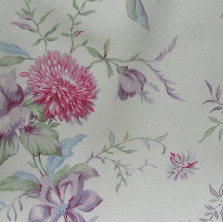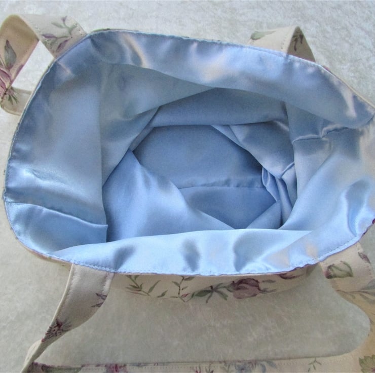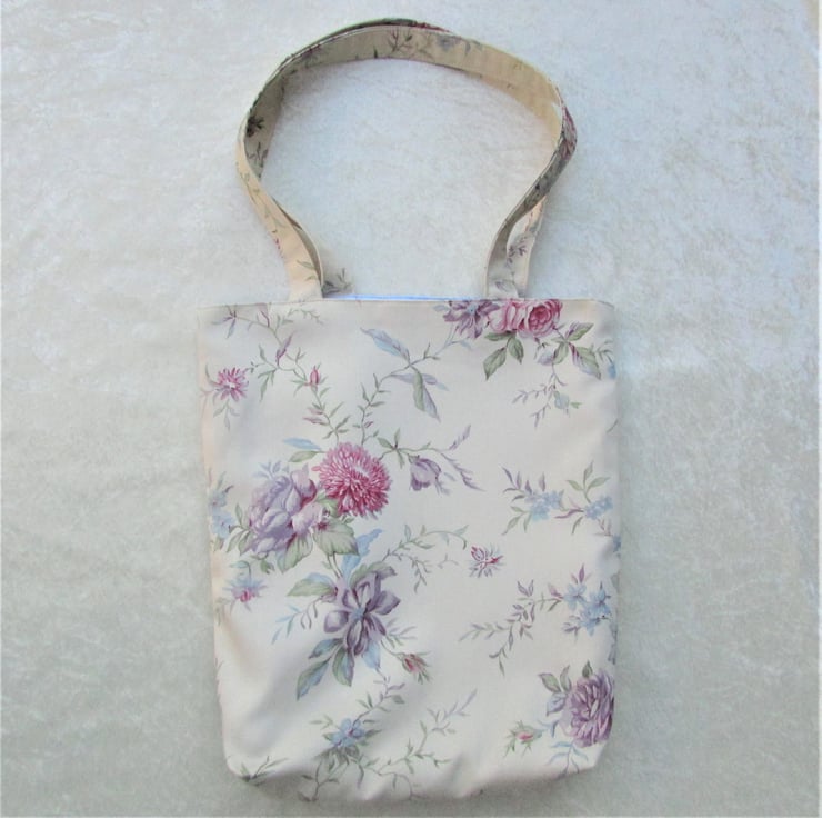 A pretty tote bag in a delightful floral-print fabric. The fabric print features delicate sprays of flowers in shades of pink, lilac, pale blue and green on a cream background. The pretty pastels and delicate pattern give this tote bag a very romantic summery feel. The bag is lined with a pale blue satin fabric.
